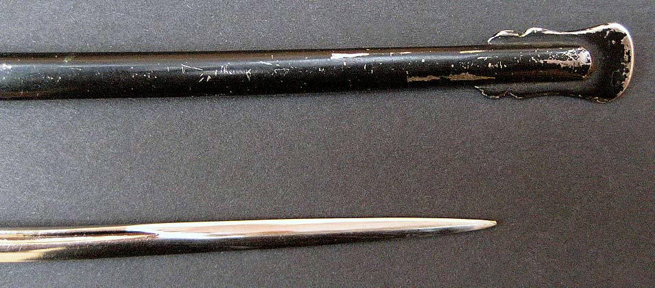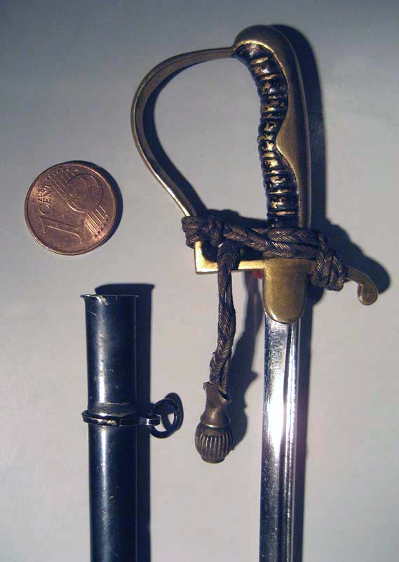 Detailliert und solide gefertigtes zeitgenössisches Stück mit 18,5 cm "Klingenlänge". Roter Stoßfilz und Portepee. Scheide mit beweglichem Tragering.