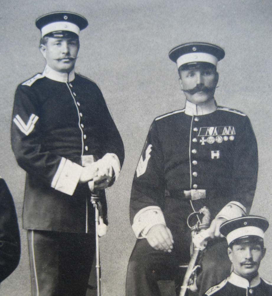 Unteroffizierchargen um Kragen und Aufschläge silberne glatte Tressen. Etatsmäßige Wachtmeister und Stabstrompeter oberhalb der Aufschläge noch eine zweite, schmälere Tresse (A. K.-O. vom 28. Juli 1889). (...)