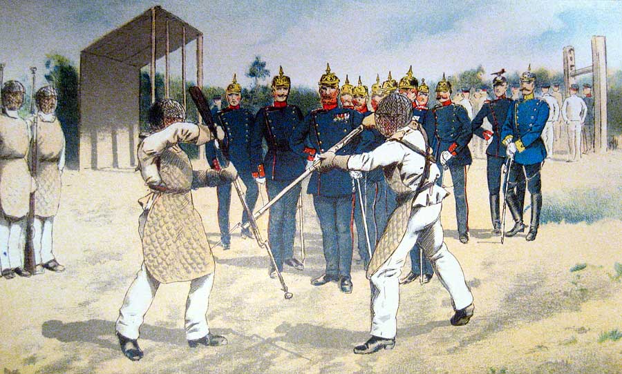 Diese Trainingsgewehre gab es nicht nur im Deutschen Reich, sondern natürlich auch bei den anderen Armee. Sogar aus der Zeit des ausgehenden 18. Jahrhunderts sind solche Stücke bekannt. Diese Fechtgewehre hatten anstelle eines richtigen Bajonetts einen metallenen oder auch hölzernen Bajonettersatz mit Leder- oder Stoffpolster an der Stoßseite. Dieser Bajonettersatz war im Vorderschaft des Gewehres federnd gelagert, so dass das Bajonett beim Auftreffen auf den Gegner nachgeben konnte. Allerdings war diese Spiralfeder recht kräftig, so dass trotz Elastizität ordentliche Stöße unvermeidbar waren - deswegen auch der Körperschutz.