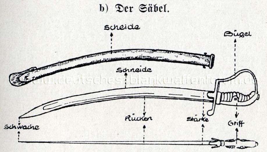 Berittene zu Pferd tragen den Säbel am Sattel, zu Fuß am Säbelkoppel.