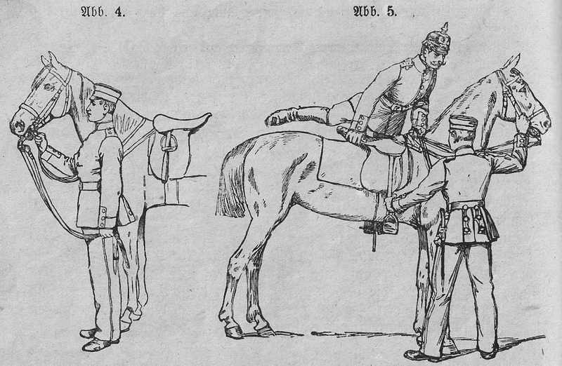 Der Vollständigkeit halber, weil in obiger Quelle vorhanden, ein Soldat mit angelegtem Seitengewehr, der seinem Vorgesetzten das Reitpferd nach dem Absitzen (Abb. 4), bzw. direkt beim Auf- oder Absitzen hält (Abb. 5).