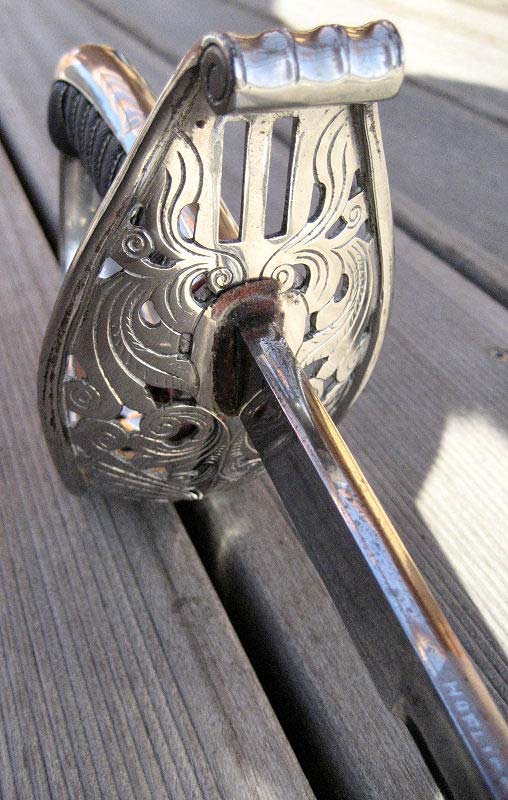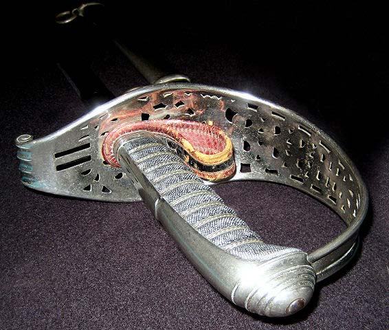 Vernickeltes, durchbrochenes Gefäß mit zwei Fausriemenschlitzen nach österreichischem Muster 1845. Lederne Fingerschlaufe rot-schwarz-rot. Ähnlich in Hessen, Württemberg und anderen um die Zeit der Einigungskriege eher zu Österreich tendierenden Staaten zu finden - bei dem im Forum vorgestellten