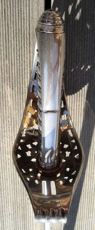 Schlanke vernickelte Klinge mit langer Fehlschärfe und beidseitigem Hohlschliff; Ort in der Mittellinie.