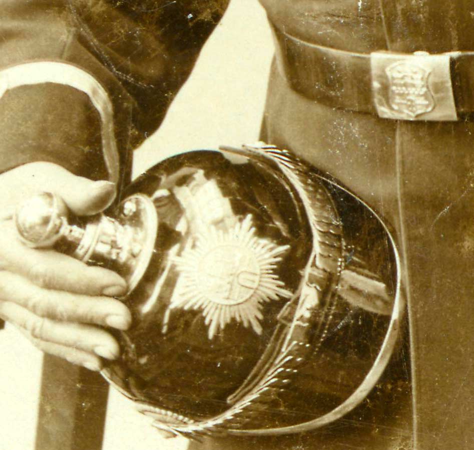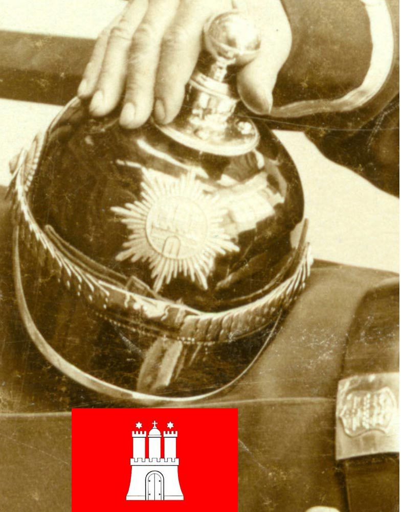 Das Koppelschloß trägt wie auch der Helmzierat das Hamburger Wappen.