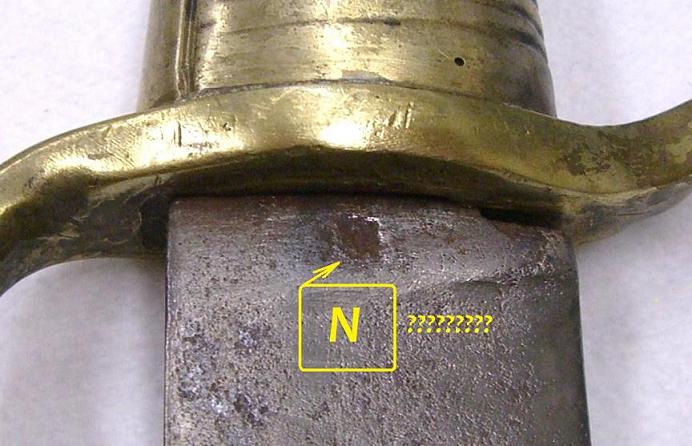 Die Klingenrückengravur ist leider so verwaschen, dass man sie nur entziffern kann wenn man weiß was es heißen soll. Unterhalb der Parierstange sind auf der Klinge noch die Überreste eines Stempels ( N ??? ). Sonst ist der Säbel stempelfrei. Die Maße sind mit dem Spanier identisch.
