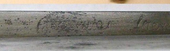 Die Klingenrückengravur ist leider so verwaschen, dass man sie nur entziffern kann wenn man weiß was es heißen soll.