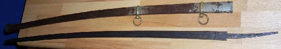 Eine Scheide habe ich auch dazu, ist aus Stahl war "versilbert" und sehr rostig.. mit 2 "ösen" zum Aufhängen am Gürtel schätze ich..