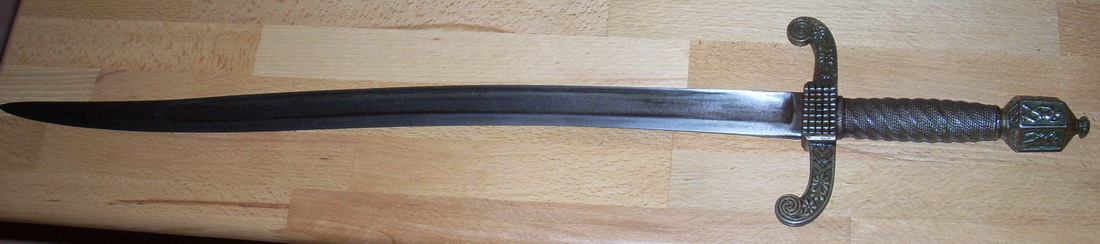 Also ich habe mir das Gefäß jetzt wirklich mal sehr genau angesehen und ich denke nicht, dass das Touristenramsch aus den Südländern ist, der ist im allgemeinen weit weniger schön und vor allem viel schlampiger gemacht. Für Tourischrott sind die Details und der Guss viel zu exakt ausgeführt. Das ist sicherlich echter Historismus und damit nicht mal sooooo verdammenswert. Vielleicht findet sich ja mal auf einem Flohmarkt eine gerade Klinge, die da reinpasst?
