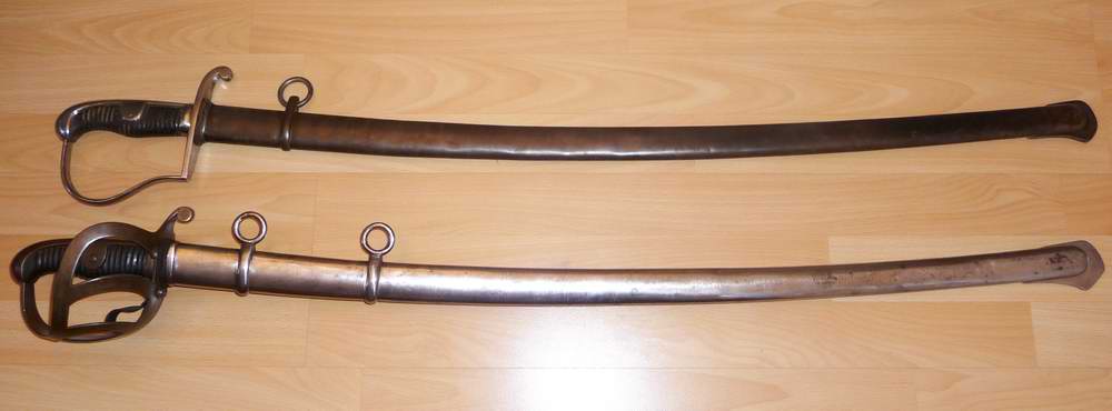 Übrigens entspricht die Scheide der gezeigten Waffe eindeutig dem sächs. Kavalleriesäbel M1867 ( Klingenlänge 870 mm ) mit den gegenüber dem preußischen M1852 feststehenden Trageringen ( s.Fotos ). Da ich kein preußisches Modell zum Vergleich der Klingen habe, kann ich nicht beurteilen ob auch eine preußische M1852-Klinge in diese Scheide passt.
