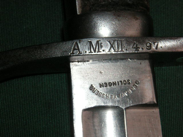- das in meiner Sammlung befindliche Stück der ersten Bauform, ebenfalls mit gerader Griffhülse, hat auf dem Klingenrücken die ziemlich frühe Abnahmestempelung von 1879, Lieferant Gebr. Weyersberg Solingen. Ich würde daher