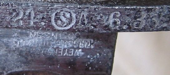 Das auf der Parierstange befindliche „S“ kann keine Hersteller- oder Reparatur-Markierung sein. Beides hätte an dieser Stelle nichts zu suchen gehabt. Hinzu kommt, daß das eingekreiste S nicht beigetrieben oder gelöscht wurde, sondern völlig normal in den Truppenstempel eingefügt wurde und auch dort sich wie selbstverständlich befindet.