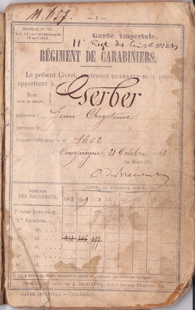 Mal etwas anderes - ein französisches Soldbuch aus der Zeit des Deutsch-Französischen Krieges. In diesem Fall vom Carabinier 2. Klasse Jean Gerber, geb. 24.01.1847 in Reiningen (canton Mulhouse). Am 21.10.1868 in das Regiment eingetreten, 3. Escadron, später Peloton hors-rang. Es folgen persönliche Angaben zu Physis (Immerhin 1,80 m - für damalige Verhältnisse recht groß!) und Bildung ("weiß zu lesen, schreiben und zählen").