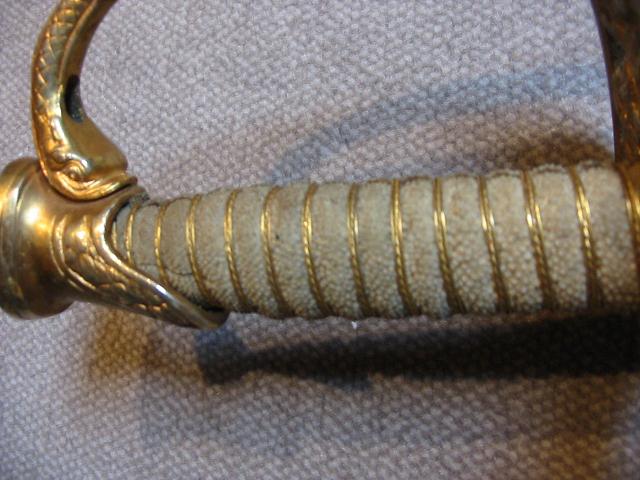 Griff mit weißer Rochenhaut(?) und dreiteiliger Drahtwicklung (glatt/gedreht/glatt),