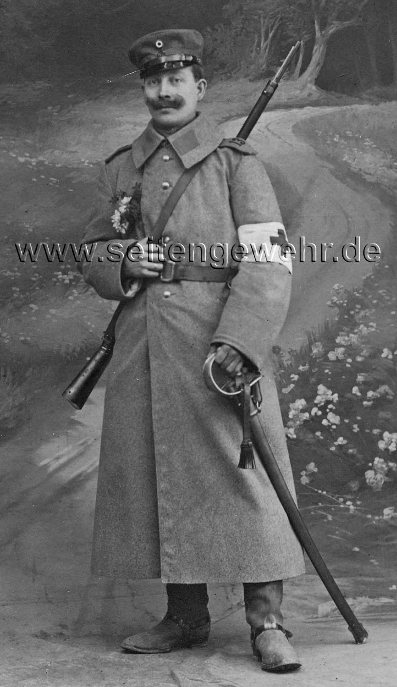 Hier einmal ein Sanitäter aus dem Train-Bataillon Nr. 13. Der alte Reitersäbel nun in einer geschwärzten Scheide mit einem Ring. Gut sichtbar auch die Abnahmestempel auf dem Kolben des Gewehrs 98.