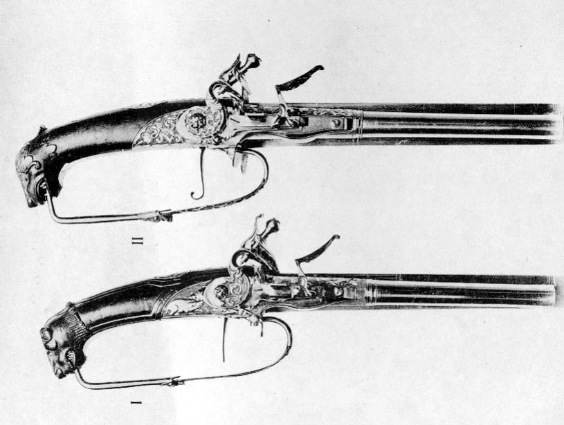 "Zwei Hirschfänger mit Schießvorrichtung (Gewehrgalerie Nr. 124/25). Hervorragende Arbeit von Niefind, dessen Name auf der Innenseite des Griffes hinter dem Abzüge bei II eingestochen ist. Der Eisenschnitt ist von bemerkenswerter Schönheit, wie überhaupt die ganze Arbeit sauber und fein ausgeführt ist. — Beide Waffen waren ein Geschenk des Oberjägermeisters von Leubnitz an August den Starken."