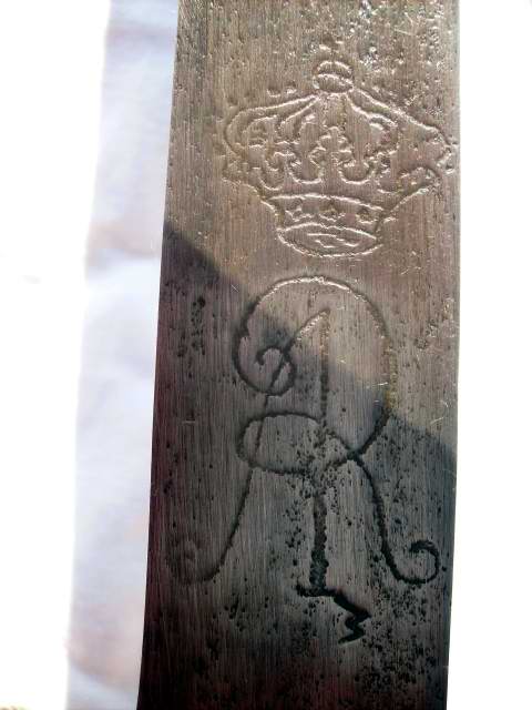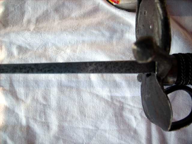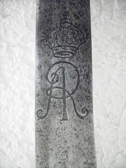 Rückenklinge: Zweischneidig auf 26 cm,mit leichten doppelten Hohlkehlungen.( Pallaschklinge) Beidseitiges gekröntes"AR"