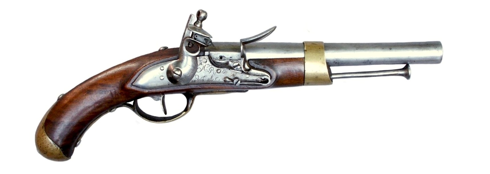 Dieses im Jahre 1786 ,noch unter dem "Ancien Regime" reglementierte Modell unterscheidet sich von den beiden späteren Versionen durch die eiserne Pfanne, den leicht tromblonierten Lauf und die "royale" Signatur auf der Schlossplatine.