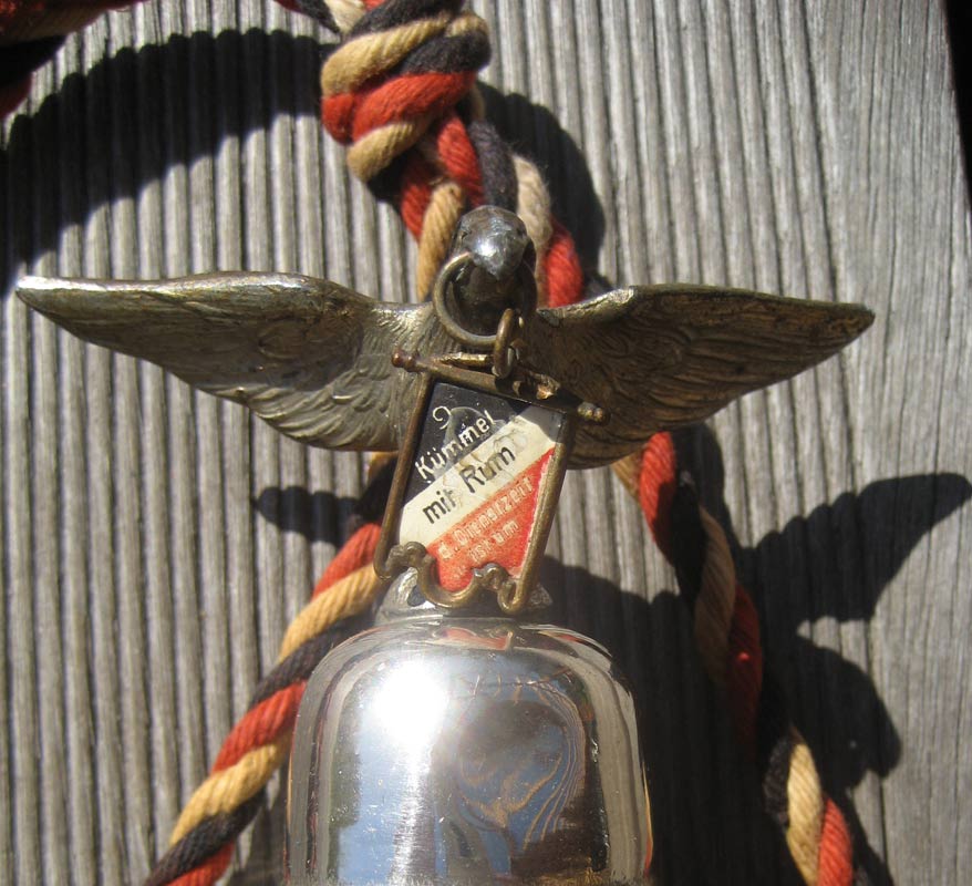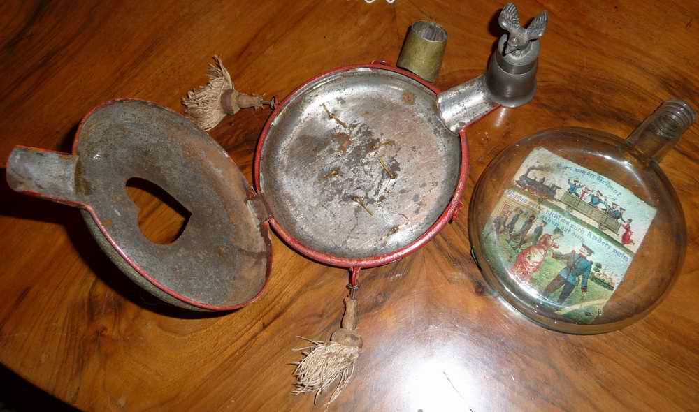 Man beachte die flotten Sprüche auf der Flaschenhülle: Dienen, auch in Friedenszeiten, bedeutete damals (wie heute), erhebliche persönlche Belastungen und ungewohnte Einschränkungen in vielen Bereichen auf sich zu nehmen. Neben dem Stolz, diese Aufgabe gemeistert zu haben, findet auch die Freude, dies nun hinter sich gebracht zu haben, mit leichtem Augenzwinkern vorgetragen, ihren Ausdruck auf Exponaten wie diesem.