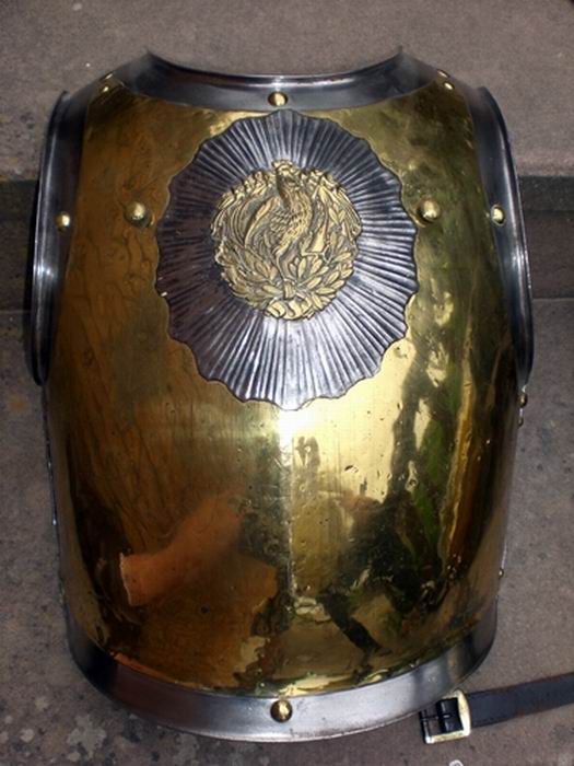 Schwere stählerne Brustplatte mit halbkugligen Messingnieten und rückwärtigen Futterhaken. Darauf ein aufgenieteter Messingplastron auf dem wiederum ein Strahlenkranz aus geripptem Stahl aufgebracht ist; in dessen Mitte aus Messing der gallische Hahn mit Standarten und Lorbeerkranz. Das Emblem ist rückwärtig mit zwei Flügelmuttern (auswechselbar) befestigt.