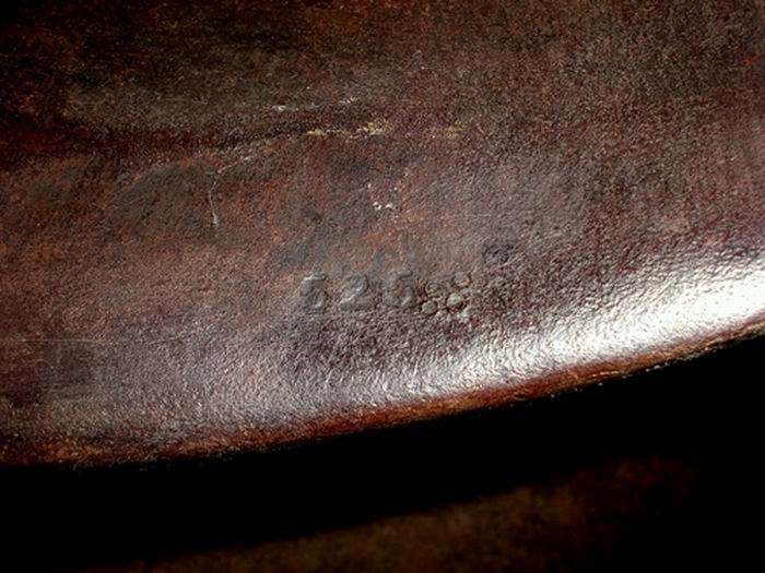 Leichteres Rückenteil ebenfalls mit Messingauflage und -nieten verziert. Dreifach vernietete doppelte Messing-Ringkette auf ledernen Schulterriemen mit schlichten Messingverschlüssen, gestempelt C . Original Bauchriemen mit Schnalle.