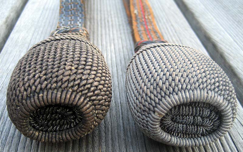 Zwei Portepees, beide mit wohl ursprünglich schwarzem Lederband, einziger Unterschied (neben der etwas variierenden Knüpfung im Stängelbereich): ein Schieber nur silber, der andere silber & rot gekennzeichnet.