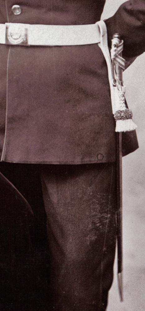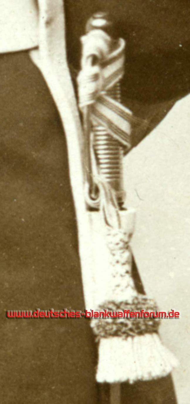 Unteroffiziertroddel am Infanterie-Seitengewehr ohne Stichblatt(?), Gardeadler am Helm(?), abgerundeter Kragen, auf der Schulterklappe ist nichts zu erkennen -