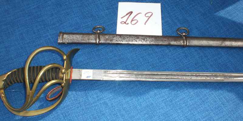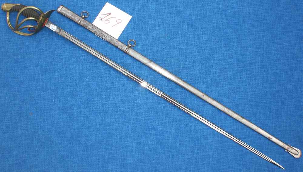 Messing-Bügelgefäß mit drei Spangen, die am Stichblatt in "Katzenpfötchen" enden. Das ovale Stichblatt ist S-förmig geschwungen. Halbe Griffkappe mit abschraubbarer Knaufkappe als Angelmutter. Gerippte Griffhülse mit Haihaut bezogen und dreifach gedrillter Kupfer-drahtwicklung; glatte Ferrule und lederne Fingerschlaufe.