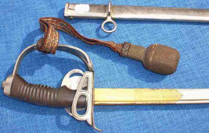 Zugehörige, vernickelte Stahlblechscheide mit einem Ringband, starrem Ring und rücks. Öse. Eingeschraubtes Mundblech.