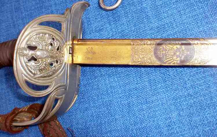 Gerade, vernickelte Steckrückenklinge mit Schör. Beidseitig ab der Wurzel 12,5 cm vergoldet und teilw. mit Rankenwerk verziert; terzs. Reichsadler in gebläutem Oval, danach gebläute Kartusche, darin in gotischer Schrift geätzt:
