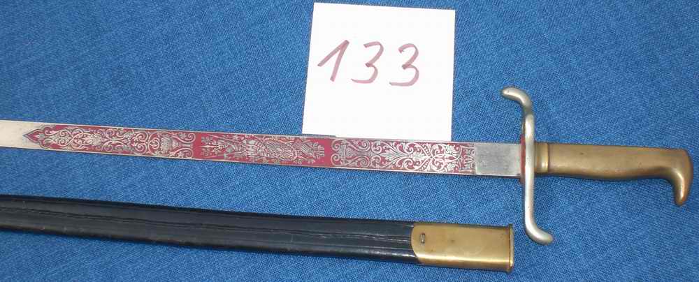 Rückenklinge mit Mittelspitze und kurzer Fehlschärfe, ab der beids. Dekorfelder ausgeätzt und die Zwischenräume mit rotem Japanlack ausgefüllt sind. Terzseitig erscheint der Name "Emil Blumer" eingefaßt von floralen Motiven und Blumenschalen. Quartseitig sind militärischen Trophäen und Ritterrüstung ebenso eingefaßt.