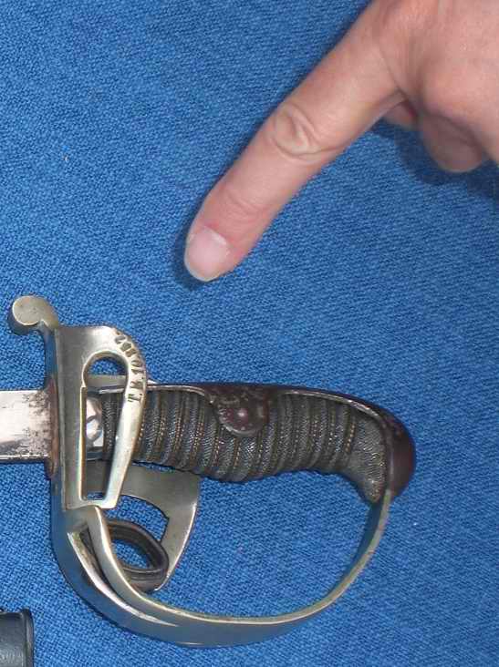 Vernickeltes glattes Stahlkorb-Gefäß (3-spangig) mit ganzer vorgezogener Griffkappe, Griffbügel im Knauf eingelassen, glatter Griffrücken, blanker Griffring; lederne, angeschraubte Fingerschlaufe. 2 Spangen anklappbar, hinterer Nebenbügel ebenfalls, gest.: T.B.10.857. Kurzes, abwärts gerundetes Parierstangenende. Bauchiger, fischhautbezogener Griff mit drei verdrillten, geschwärzten Metallfäden umwickelt.