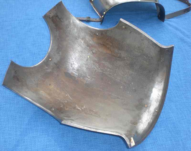 Zweiteiliger, polierter stählerner Kürass mit doppelter Messing-Ringkette auf den ledernen Schulterriemen mit schlichten Messingverschlüßen; orig. Bauchriemen; Messingnieten.