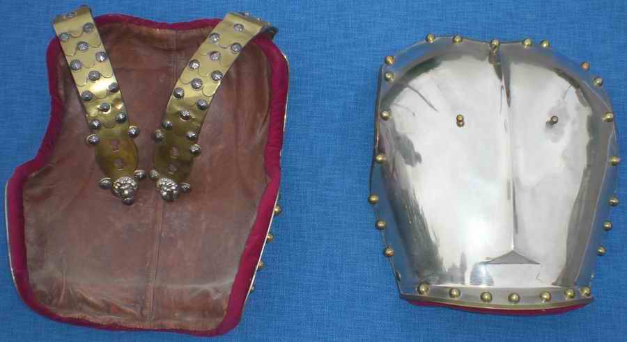 Edwardian major's plated cuirass of the Royal Horse Guards, morocco lining with crimson velvet edging, brass bound borders, domed brass studs and shoulder cords with gilded-brass endings showing fascets, leather backed brass shoulder chains and buckles. Breast- and backplate stamped with Royal Crown.