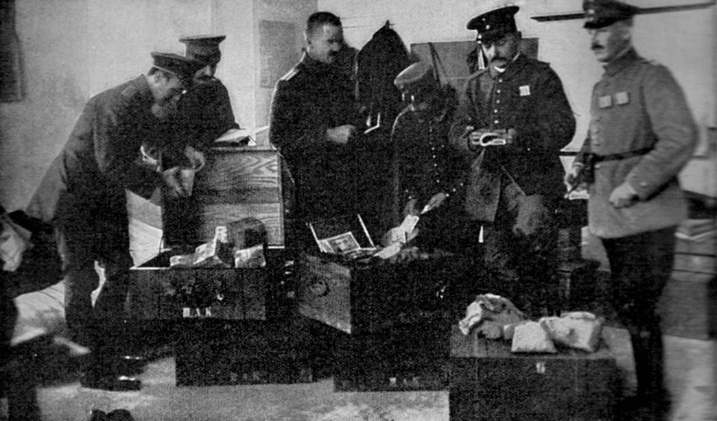 Feldkriegskasse eines bayerischen Armeekorps, die einen Wert von mehreren Millionen Mark darstellt. Die Regimenter sowie die höheren Verbände führen sehr große Kriegskassen mit sich, da die Überweisungen der Löhne und Gehälter an die Truppen regelmäßig in bar erfolgen."