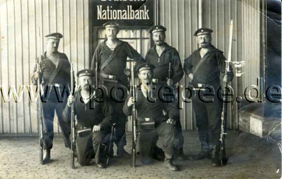 Angehörige der 4. Kompagnie der 9. Seewehrabteilung. Eingesetzt als Bewachung der Deutschen Nationalbank. Fotopostkarte aus dem Atelier Heinrich Barkhausen, Lehe.