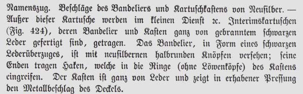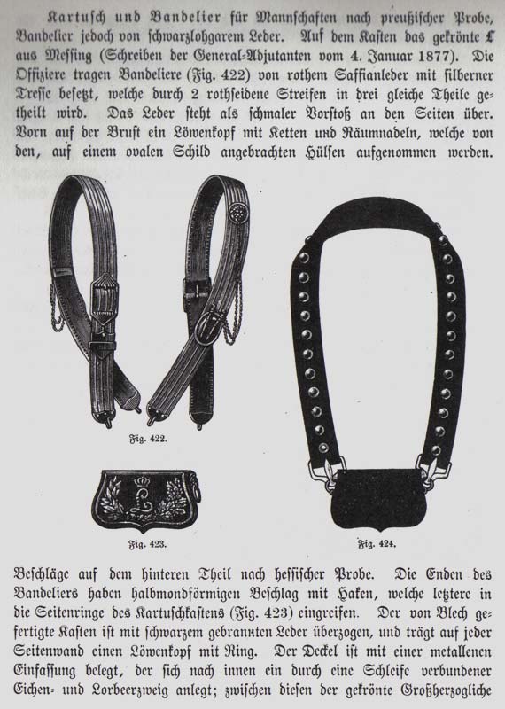 Kartusche und Bandelier des Großherzogl. Hess. Trains wie das der hess. Dragoner (siehe Text und Bilder im Anhang), für Offiziere jedoch mit goldener Tresse und dunkelblauem Tuchfutter, Beschläge vergoldet.