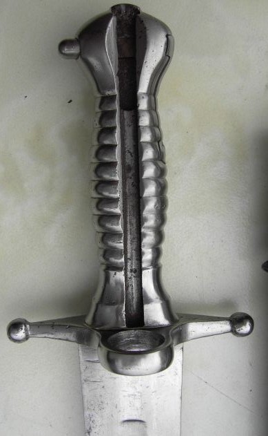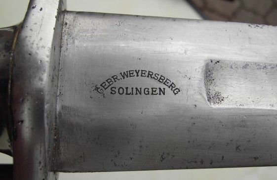 Zugehöriges, aufpflanzbares Haubajonett mit eisernem Griff und Parierstange, diese mit Ringöse zum Aufstecken auf den Lauf. Herstellersignatur an der Fehlschärfe „