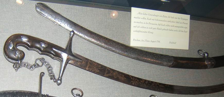 "Mein lieber Generalmajor von Zieten, Ich habe mir das Vergnügen machen wollen, Euch mit beikommendem türkischen Säbel ein Präsent zu machen, in der Persuation, daß solches nicht unangenehm seyn, und ich solchen in recht gute Hände gebracht haben werde. Ich bin Euer wohlaffektionirter König.