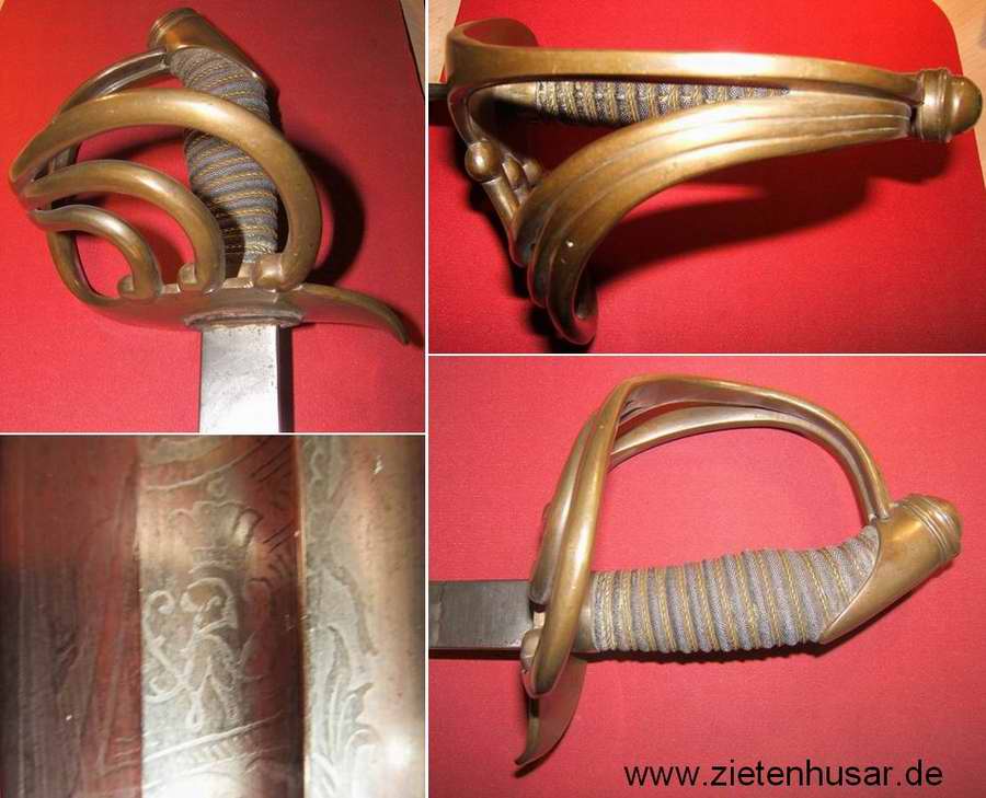 Ein Kürassierdegen ohne Herstellerangabe und Devise, aber mit schwacher Trophäen- und Rankenätzung, sowie mit WR-Monogramm, darüber eine Königskrone (siehe zweites Bild).