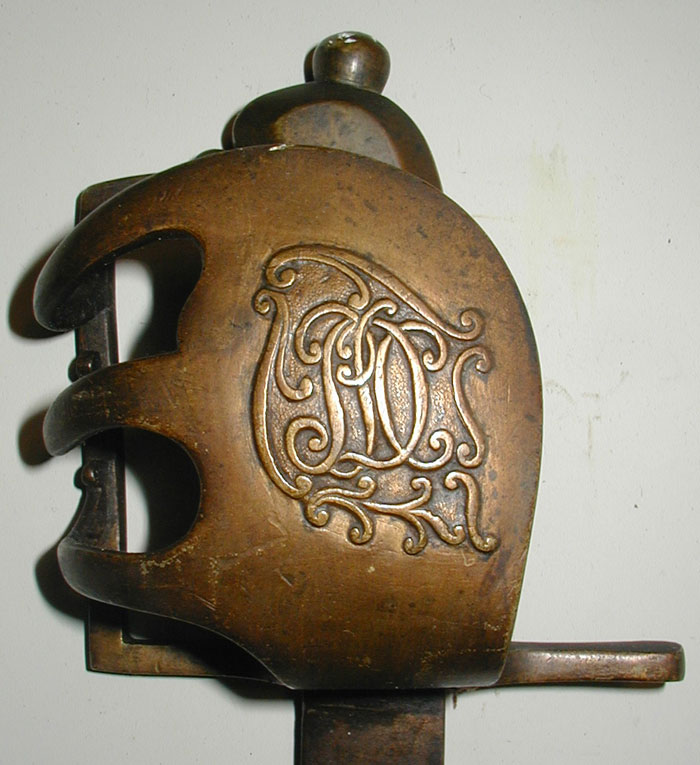 Der Hauptansatz zur Identifizierung dieses Pallaschs liegt zum einen in der Deutung des bis jetzt noch unbekannten, unbekrönten Monogramms "PDC", was darauf schließen läßt, dass es sich hier um keine Herrscherchiffre handelt, sondern möglicherweise die Abkürzung eines Mottos o.ä.. Zum andern - und das ist wohl der Knackpunkt - liegt der Ansatz zur Identifizierung darin, dass der Pallasch mittels zweier Nocken an einer Feuerwaffe aufpflanzbar ist. Derartiges hat es in Frankreich Mitte des 19. Jahrhunderts bei den Cent Gardes gegeben, wenngleich die Aufpflanzverriegelung auf andere Art und Weise erfolgte.