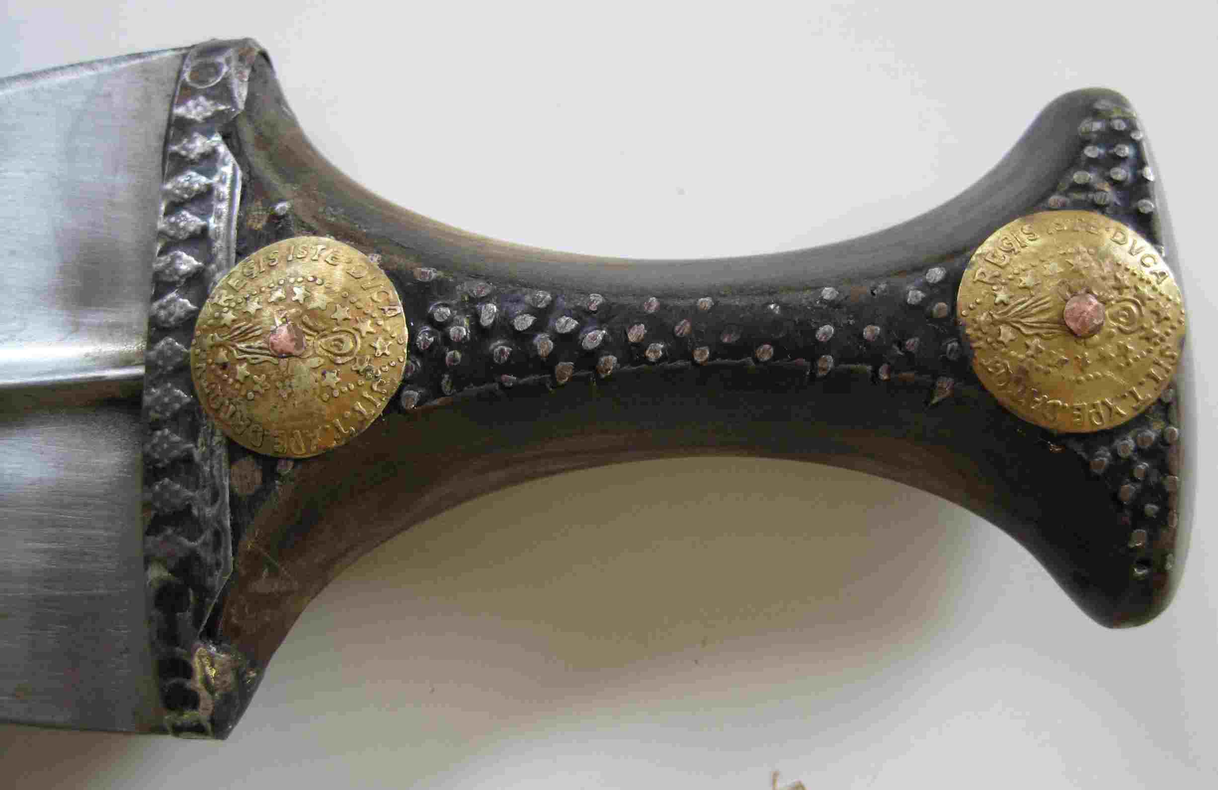 Frage an die Lateiner unter den Forumsmitgliedern? Auf dem Griff sind zwei Münzen (???) aufgenietet. Was steht darauf?