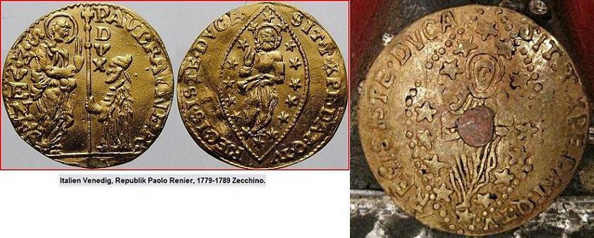 diese pdf-Datei*) gefunden. Laut der angegebenen Webseite stammt die Münze (falls zeitgenössisch!) aus der Mitte des 16. Jahrhunderts (Venedig). Allerdings fehlt bei Deinen Münzen am Ende von DUCA das T.
