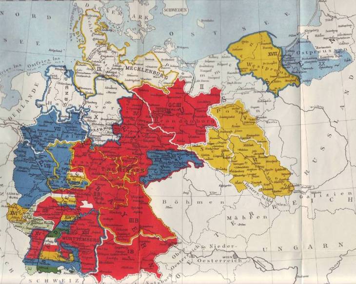 Habe hier eine schöne Karte des Deutschen Reiches. Man sieht alle Armeekorps. Die verschiedenen Farben bedeuten gleichzeitig die Farbe der Schulterklappen bei dem bunten Rock