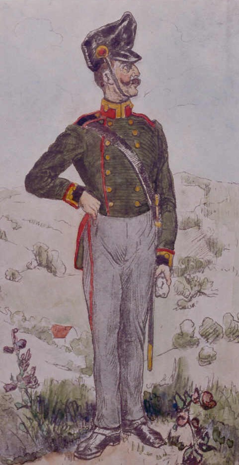 Die Wappen der drei Staaten finden sich auch auf der hier dargestellten Landwehrfahne. Die Uniform der Landwehr glich derjenigen der Infanterie, nur ersetzte im Felde den Czako eine Mütze mit Messingkreuz, das die Inschrift trug: „Fürs Vaterland 1814„