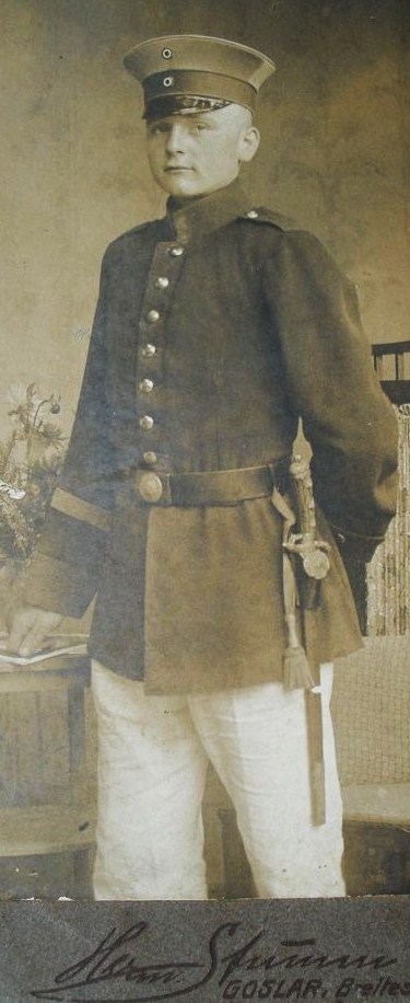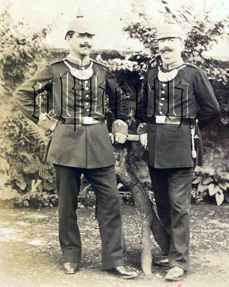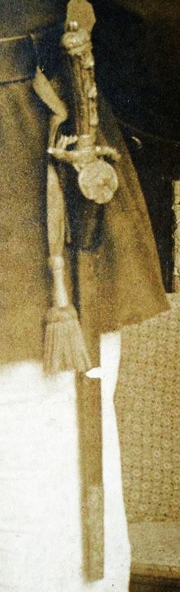 Die Bewaffnung des linken Beamten könnte der Füsilier-Offizier-Säbel sein. Der rechte trägt eine Art Hirschfänger mit glattem Horn- oder Holzgriff , s-förmig bewegter Parierstange und Griffkappe mit Vernietung oder Verschraubung in einer brünierten Metallscheide.