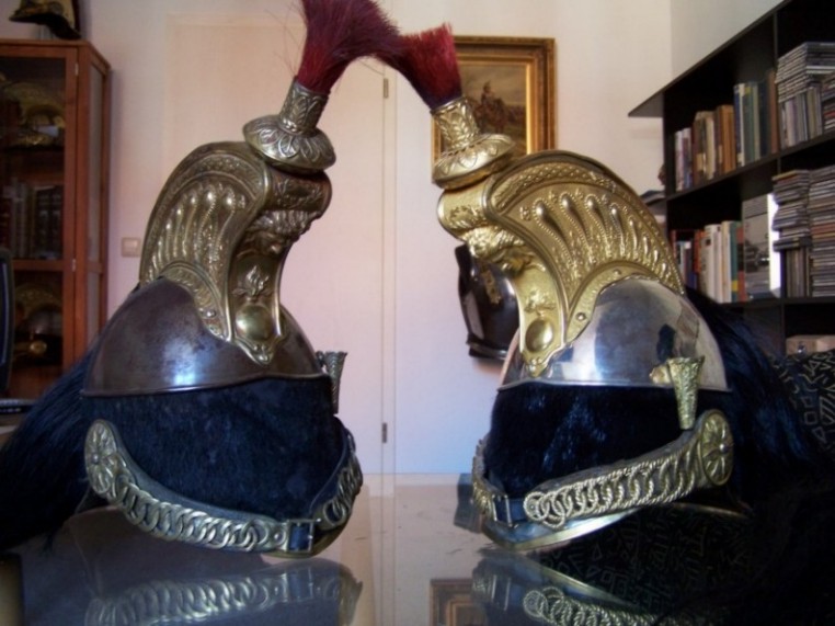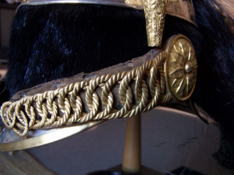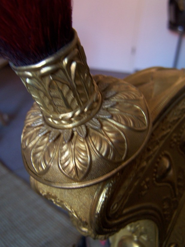 Die Helmglocke ist aus Kupfer und versilbert. Kamm, Federbuschhalter, Ringketten und Randeinfassungen sind aus Messing und vergoldet. Die Marmouset ("Rasierpinsel") hat einen zusätzlichen Kranz aus Lorbeerblättern. Außerdem sind die Ringe der Ketten nicht glatt sondern strukturiert. Insgesamt ist der Helm wesentlich feiner und aufwendiger gearbeitet als die Ausführung für die Truppe. Ganz unten mal der direkte Vergleich - links Truppe, rechts Offizier.