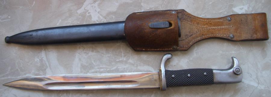 Sollte die Fabrikmarke nichts anderes ergeben , würde ich das Seitengewehr auf Grund der angeblich gepressten Ledergriffschalen mit Dreifachvernietung , der Form des Griffkopfes (leichte Formabweichung zu späteren Fertigungen)und des Stahlgefäßes in die Zeit des 1.Weltkrieges einstufen.Diese Seitengewehre wurden 1915 auch von Offizieren , nach ablegen des langen Ofiziersseitengewehres getragen.