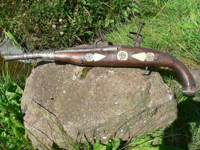 Deine Pistole stammt aus Algerien/Nordafrika. Sie hat ein sogenanntes Kabylenschloss, eine späte Abart des in Holland im Ausgang des 16. Jahrhunderts entwickelten Schnappschlosses. Trotz dieser frühen Datierung des Vorbildes ist die Pistole sicherlich erst zu Beginn des 19. Jahrhunderts von einem einheimischen Handwerker in Algerien gefertigt worden.