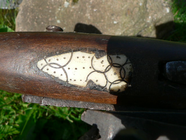 Sie hat Beineinlagen mit einem Muster, dieses Muster ist fast das gleiche, wie das auf der Klinge meines Messers/Säbels(Anfrage bei Blankwaffen) und ich vermute, dass sie aus der gleichen Zeit oder Gegend stammen könnten!