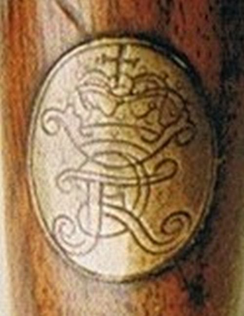 Die hier gezeigte, in späterer Zeit um 20mm gekürzte Pistole ist, wie das Herrscher-Monogramm „FR“ auf ihrem Daumenblech beweist, noch in der Reiterei Friedrichs des Großen verwendet worden. Nach dem Regierungswechsel im Jahre 1740 hat man sein Signum neu eingraviert, nachdem das alte Monogramm „FWR“ abgeschliffen worden war.